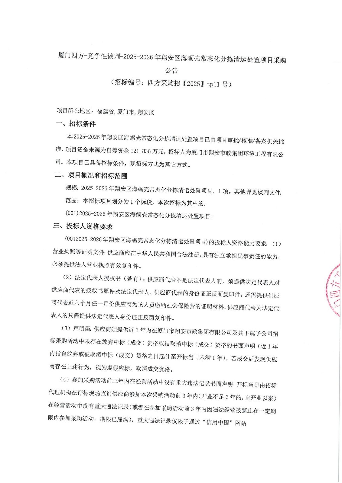 厦门四方-竞争性谈判-2025-2026年翔安区海蛎壳常态化分拣清运处置项目采购公告